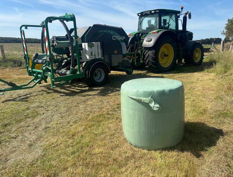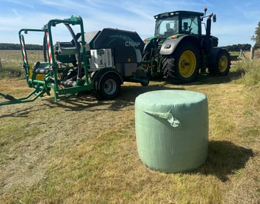 2024, nous faisons le choix d'investir dans un second groupeur. Toujours dans le but d'accroître notre production, mais aussi pour répondre aux aléas climatiques. Nous achetons également une presse enrubanneuse venant des Pays-Bas, afin de produire des ballots d'enruabannage de 100-120kg.